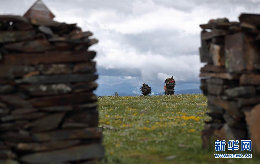在川藏公路四川折多山埡口,藍天白云與經(jīng)幡、草地、鮮花構(gòu)成一幅美麗畫卷(6月28日攝)。新華社記者江宏景攝