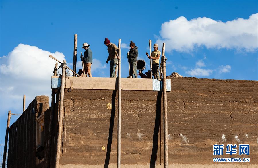 在317國道邊的四川甘孜縣呷拉鄉(xiāng),藏族群眾在修建傳統(tǒng)民居(11月3日攝)。新華社記者江宏景攝