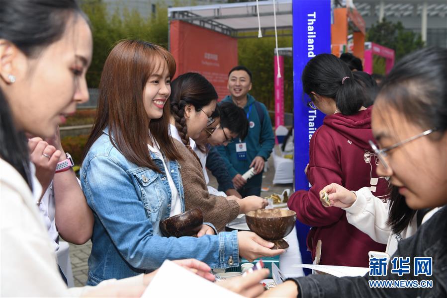11月17日,來自泰國的留學生(左二)在國際文化節(jié)上將美食給觀眾品嘗。新華社記者 張端 攝