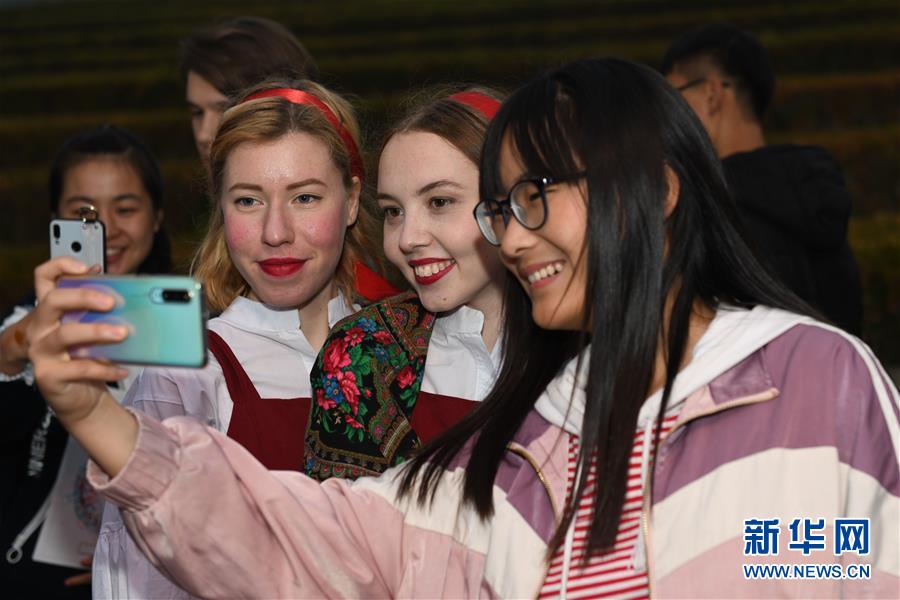 11月17日,來自俄羅斯的留學生在國際文化節(jié)上與觀眾合影。新華社記者 張端 攝