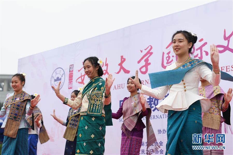 11月17日,來自老撾的留學生在國際文化節(jié)上表演舞蹈。新華社記者 張端 攝