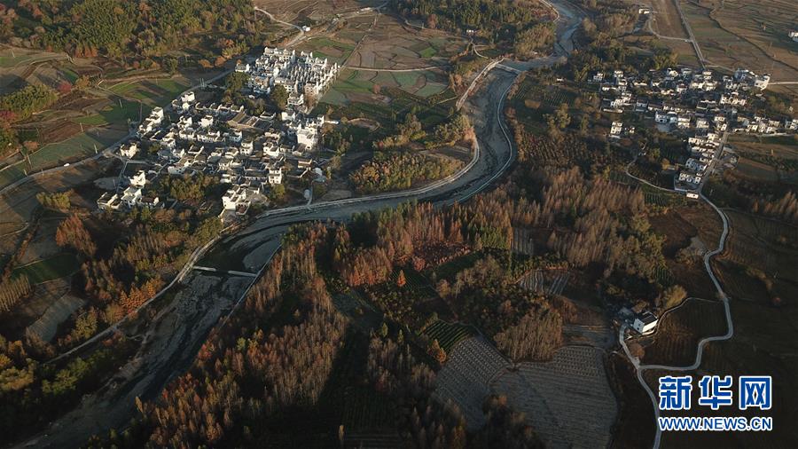 這是11月15日無(wú)人機(jī)拍攝的安徽黟縣宏村風(fēng)景區(qū)附近的村落。新華社記者張端攝