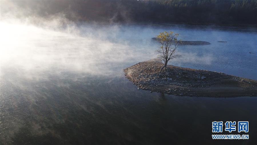 11月14日無人機(jī)拍攝的安徽黟縣奇墅湖晨景。新華社記者張端攝