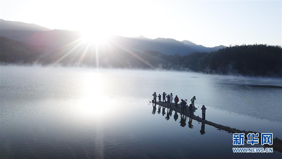 11月14日,游客在奇墅湖邊拍照(無(wú)人機(jī)拍攝)。新華社記者張端攝