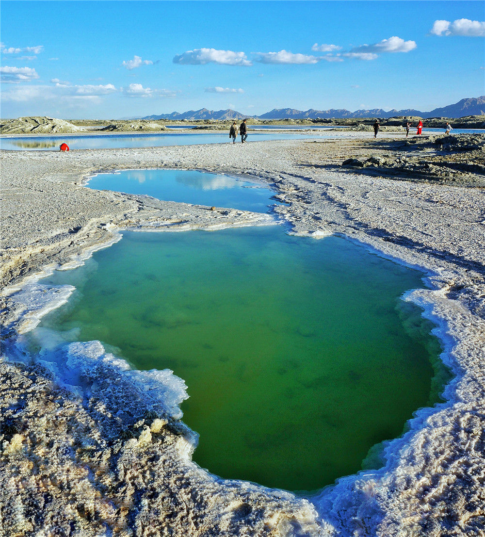 2017年8月,青海西寧,翡翠湖隨著日光的不同,出現了不同是顏色。