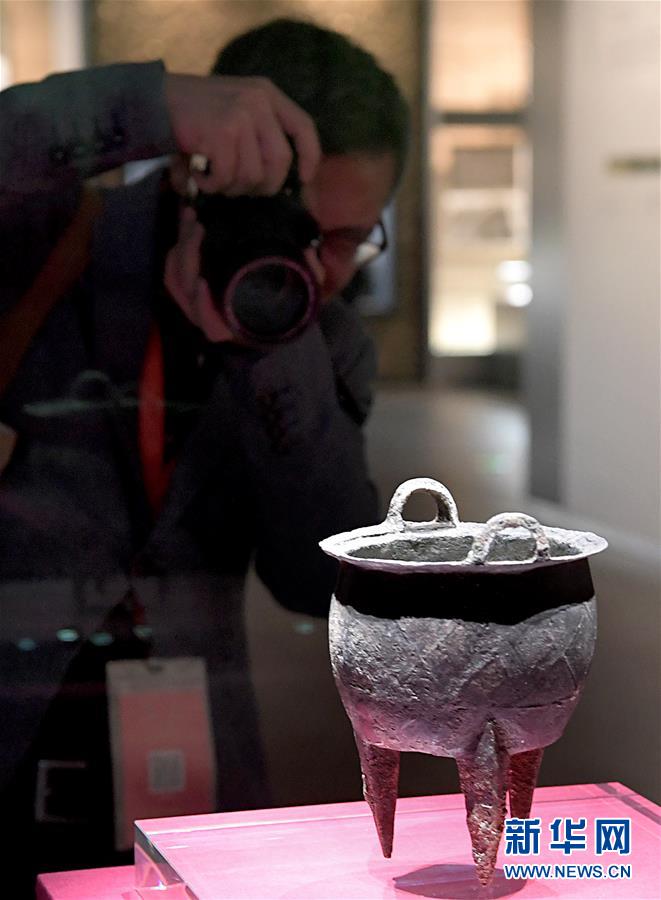 10月19日,參觀者在二里頭夏都遺址博物館內(nèi)拍攝展品“網(wǎng)格紋銅鼎”。新華社記者李安攝