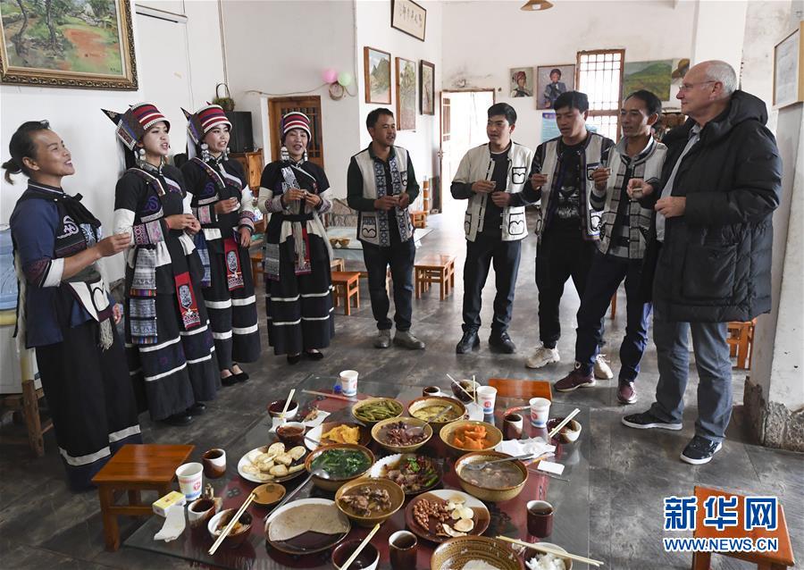 11月28日,大糯黑村村民畢興學(xué)(左五)、李學(xué)芝(左一)夫婦和工作人員們一起給外國(guó)游客(右一)祝酒。李學(xué)芝和丈夫畢興學(xué)經(jīng)營(yíng)著一家農(nóng)家樂(lè),生意紅火。新華社記者王全超攝