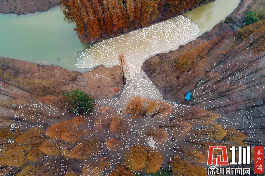 2019年12月1日,江蘇省宿遷市泗洪縣,航拍5000多只四季鵝在陳圩林場的樹林下吃食的壯觀場景。
