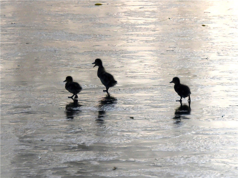 2019年12月2日,北京玉淵潭公園湖畔,三只野鴨寶寶在冰面上行走、湖中游弋,呆萌可愛。