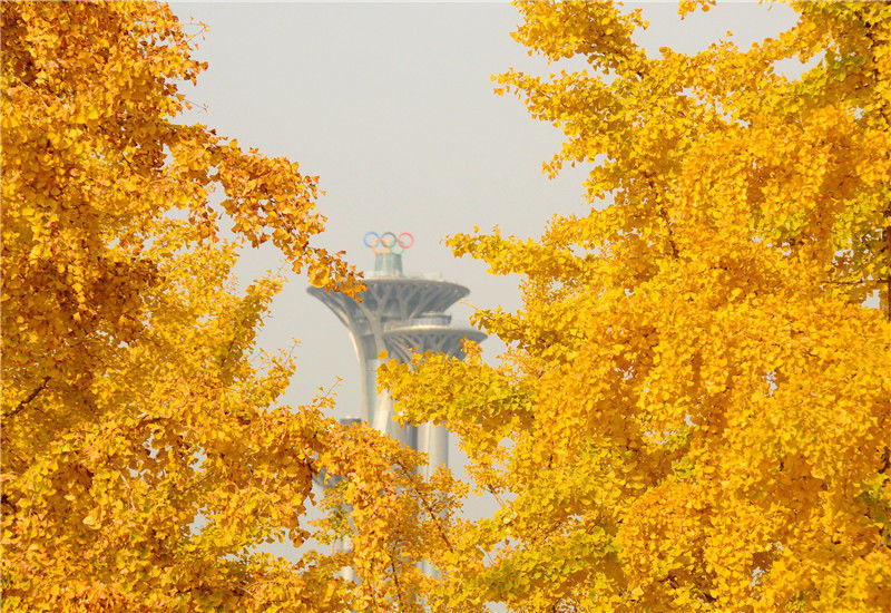 2019年11月1日,北京,深秋時(shí)節(jié),奧林匹克公園的銀杏樹一片金黃,與鳥巢、水立方等景觀交相輝映,美不勝收。