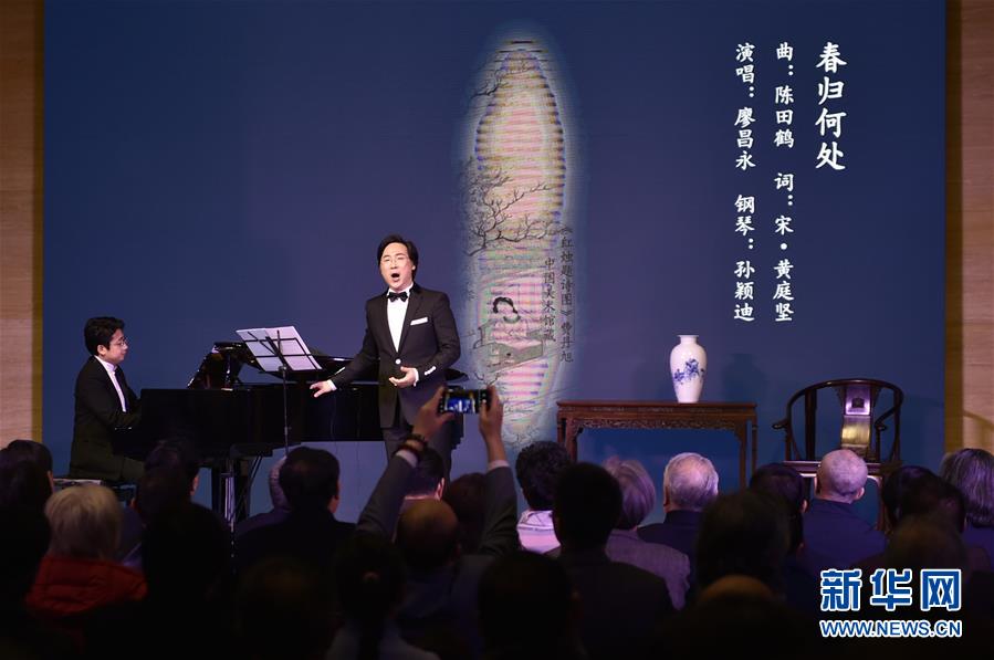12月10日晚,廖昌永在音樂會上演唱《春歸何處》。 當(dāng)晚,中國古典詩詞與書畫——廖昌永中國藝術(shù)歌曲獨唱音樂會在北京中國美術(shù)館舉行。 新華社記者 魯鵬 攝