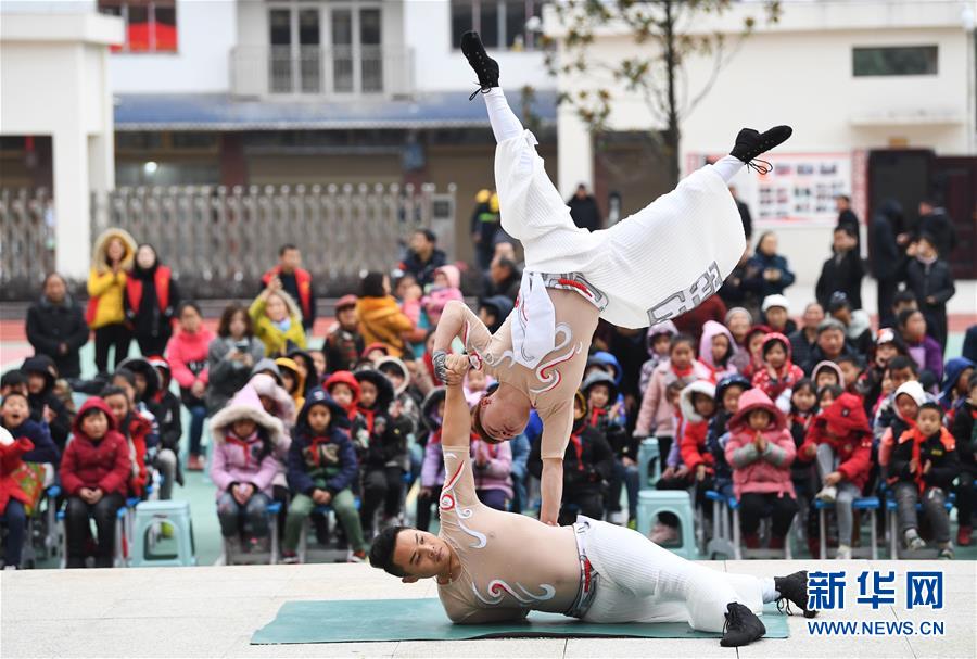 12月12日,文藝志愿者在中益鄉(xiāng)小學(xué)表演雜技《中國(guó)力量》。
