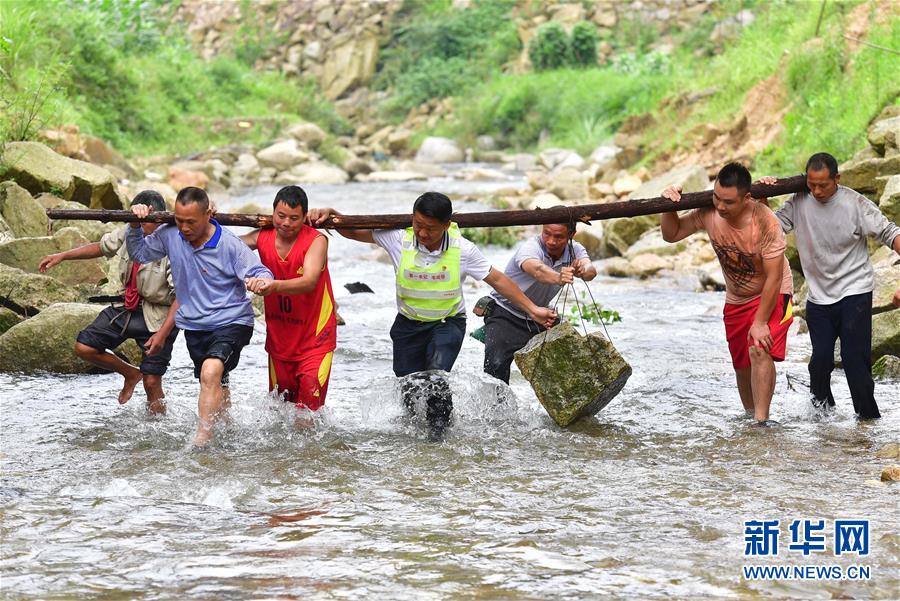 在位于黔桂交界的烏英苗寨,駐村第一書記韋桂華(右四)、黨員梁成兵(右三)、梁志新(左二)帶領(lǐng)村民維修河堤(6月30日攝)。烏英苗寨聯(lián)合黨支部在各項工作中積極發(fā)揮引領(lǐng)作用,帶領(lǐng)群眾穩(wěn)步走在脫貧致富的道路上。新華社記者黃孝邦攝