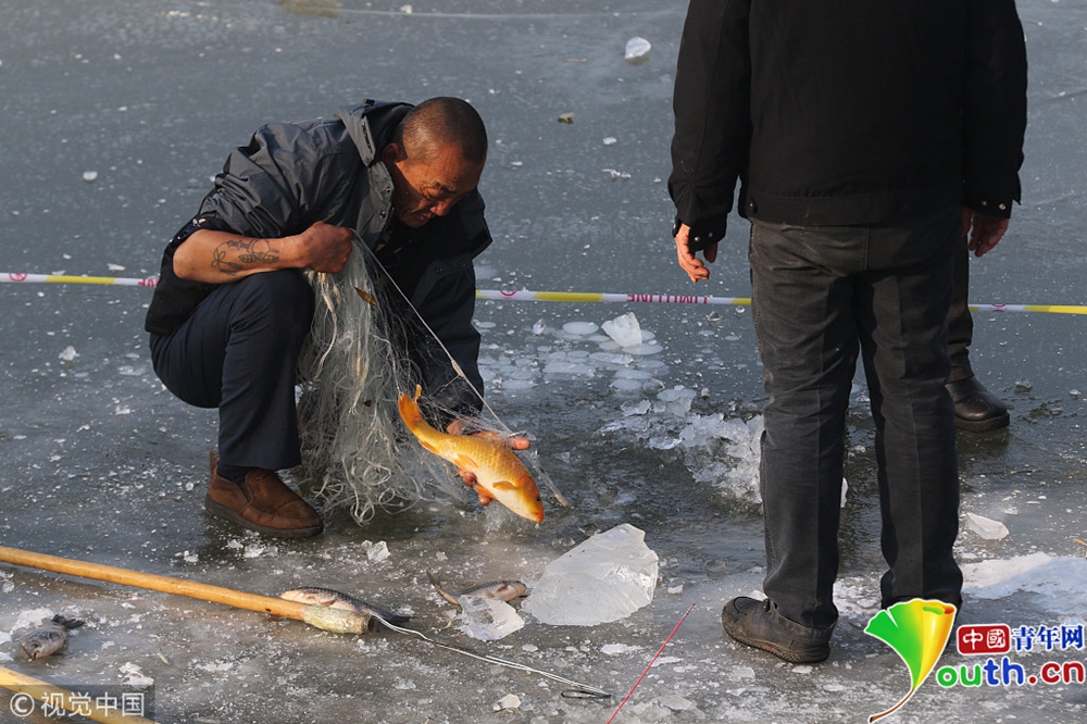 2018年11月25日,黑龍江省哈爾濱市,松花江封江不久,已經(jīng)有人蹬江鑿冰下網(wǎng)捕魚。圖片來(lái)源:視覺(jué)中國(guó)
