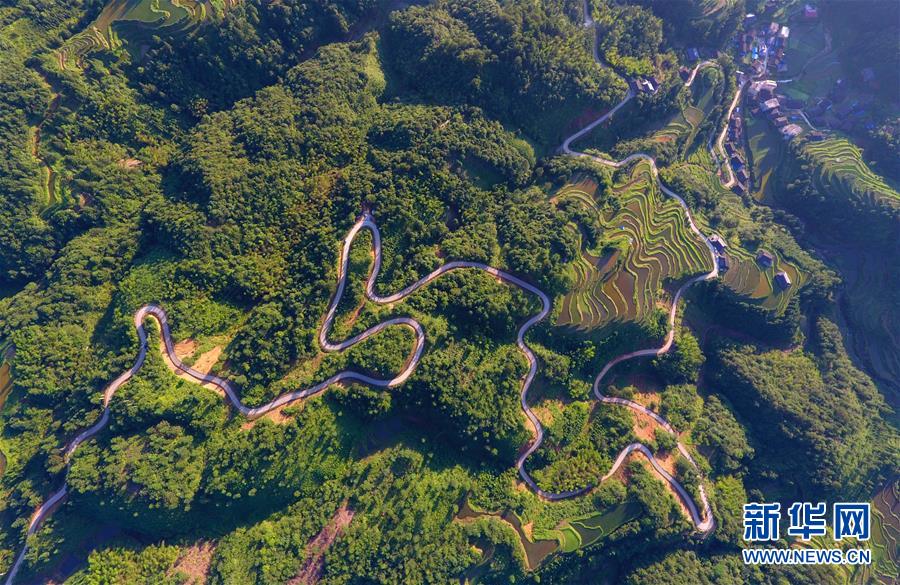 這是融水苗族自治縣桿洞鄉(xiāng)百秀村孔門苗寨的公路(6月14日無人機(jī)拍攝)。新華社記者黃孝邦攝
