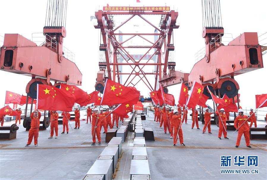 9月25日,中鐵大橋局的建設(shè)者在平潭海峽公鐵大橋施工現(xiàn)場歡慶大橋成功合龍。新華社記者林善傳攝