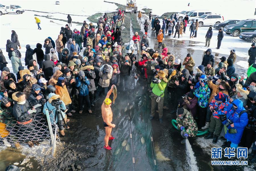 12月18日,一名冬泳愛好者展示冬捕魚(無人機(jī)拍攝)。 當(dāng)日,位于內(nèi)蒙古呼倫貝爾大草原上的諾干湖舉行冬捕活動(dòng),吸引不少游客前來觀看。冬日的諾干湖冰雪覆蓋,諾干湖冬捕也是當(dāng)?shù)囟韭糜蔚奶厣顒?dòng)之一。 新華社記者 劉磊 攝
