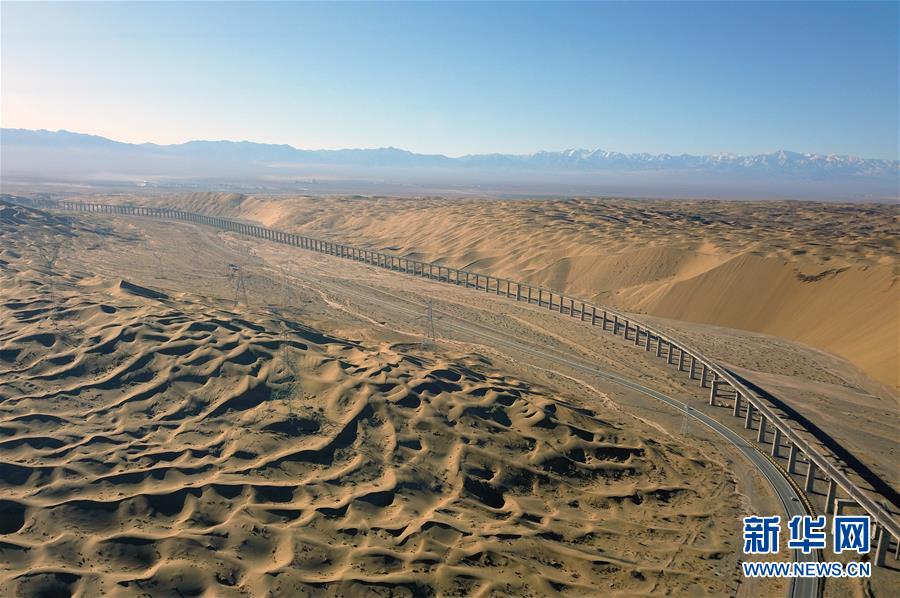 這是敦格鐵路沙山溝特大橋(12月11日無人機(jī)拍攝)。 敦(煌)格(爾木)鐵路沙山溝特大橋位于甘肅省酒泉市阿克塞哈薩克族自治縣境內(nèi)的庫姆塔格沙漠內(nèi),是一座穿越活動(dòng)性沙漠地區(qū)的特長(zhǎng)橋梁,也是敦格鐵路的重難點(diǎn)控制工程。據(jù)介紹,橋梁所在區(qū)域風(fēng)沙活動(dòng)頻繁,四季及晝夜溫差大,在建設(shè)過程中,中鐵十一局集團(tuán)有限公司的建設(shè)者根據(jù)沙層的厚度、分布及含水率的不同,總結(jié)出一套沙丘樁基施工工藝。 新華社記者 范培珅 攝