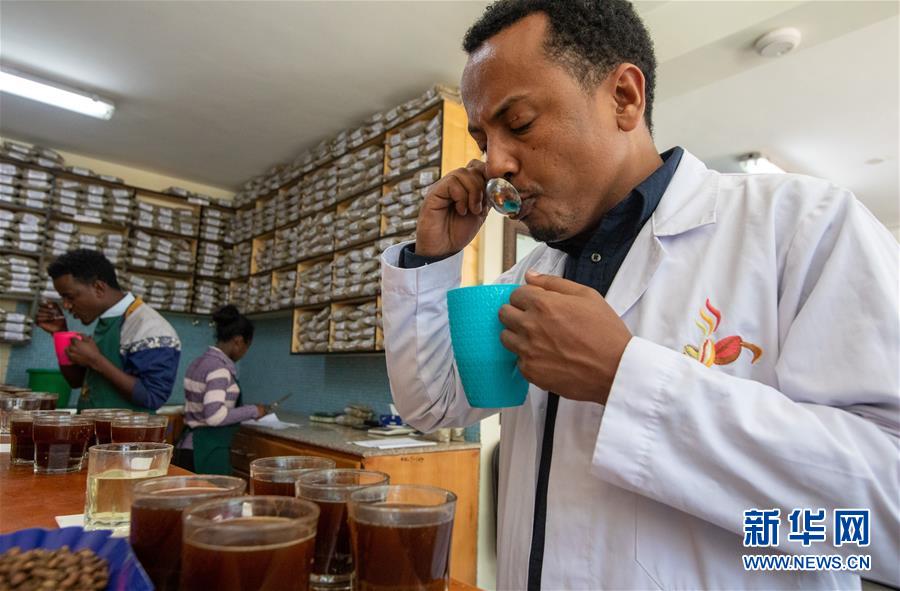 2019年10月23日,在位于埃塞俄比亞首都亞的斯亞貝巴郊外的卡辰什咖啡加工廠內(nèi),卡辰什咖啡質(zhì)量和市場總監(jiān)阿斯納克·卡薩在杯測室參與咖啡的杯測。卡辰什咖啡是埃塞俄比亞最大的咖啡生產(chǎn)商和出口商之一??ㄋ_表示,中國市場潛力巨大,埃塞俄比亞咖啡在中國市場的占有率不斷增長,進博會對埃塞俄比亞咖啡出口商來說是一個很好的機會。 新華社記者 張宇 攝