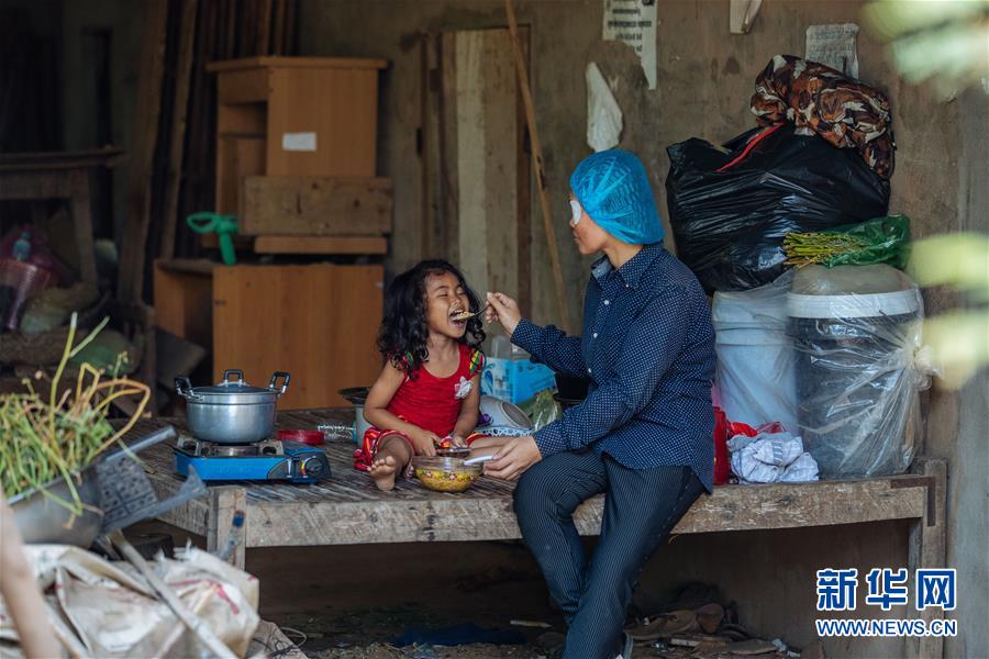 2019年3月15日,在柬埔寨磅湛,接受了白內(nèi)障手術的孫美樂回到住處給女兒喂飯。今年36歲的孫美樂是一位經(jīng)濟貧困的單身母親,和小女兒租住在一間簡陋的小屋里。她的左眼因白內(nèi)障幾近失明,無法繼續(xù)工作。在中國醫(yī)生到磅湛開展義診期間,她接受了廣西醫(yī)科大學第一附屬醫(yī)院梁皓醫(yī)生實施的白內(nèi)障手術,術后一天她的左眼即恢復視物。 新華社記者 朱煒 攝