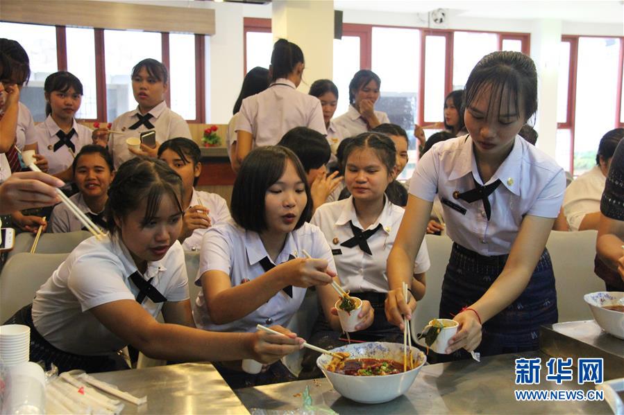 2019年8月30日,在泰國孔敬大學孔子學院,學生在孔敬大學第三屆“中國廚房”美食文化節(jié)上品嘗水煮肉片。 新華社記者 楊舟 攝