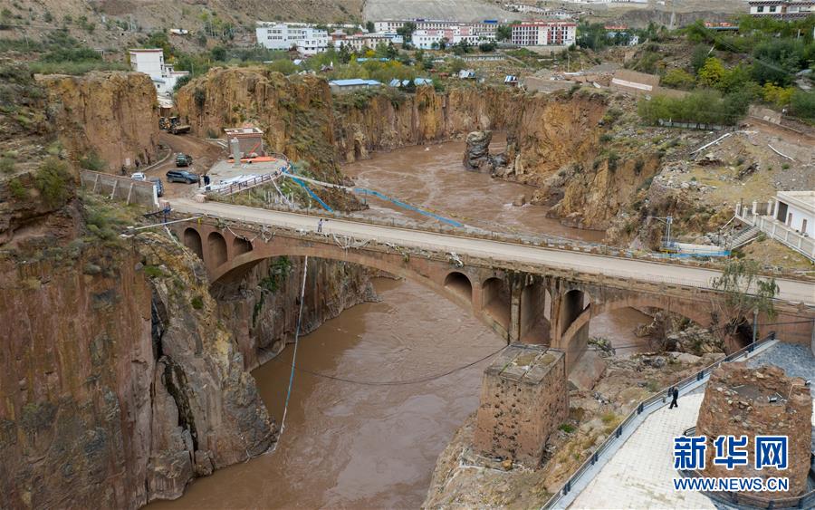 在西藏八宿的怒江大橋旁矗立著一座橋墩(10月23日攝)。據(jù)十八軍后人介紹,工兵5團(tuán)一位戰(zhàn)士修橋時(shí)過于疲憊,不慎掉入了正在澆注的橋墩中,成了永遠(yuǎn)的紀(jì)念碑。新華社記者江宏景攝