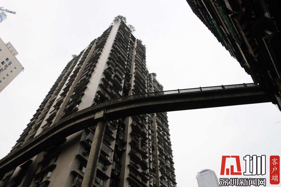 2018年4月11日,重慶市渝中區(qū)東營街,一座人行天橋離地40米,在半空中呈“S型”繞樓而過,好似一條飛揚的絲帶。該天橋橋面寬約2米,長約70米,連接大陽溝派出所和鑫龍大廈的13樓,中間僅靠一根水泥墩支撐。