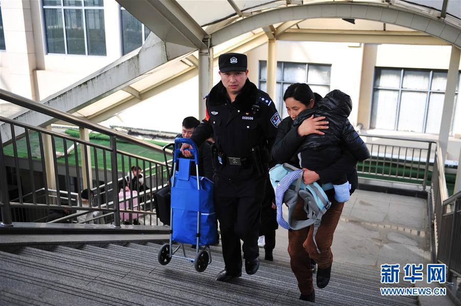 金寨火車站派出所民警何津超(前左)幫助旅客搬運(yùn)行李(12月19日攝)。新華社記者鄧堅(jiān)攝