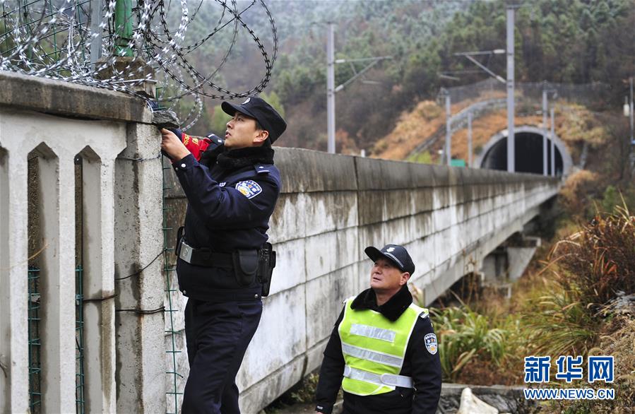 12月18日,常曉龍(左)在排查鐵路沿線護(hù)欄的安全隱患。新華社記者鄧堅(jiān)攝