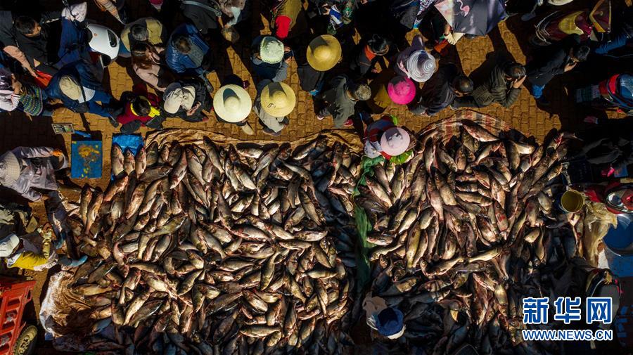 12月25日,人們?cè)谛窃坪系睦虾泳佐~市選購剛捕撈的鮮魚(無人機(jī)拍攝)。新華社記者胡超攝