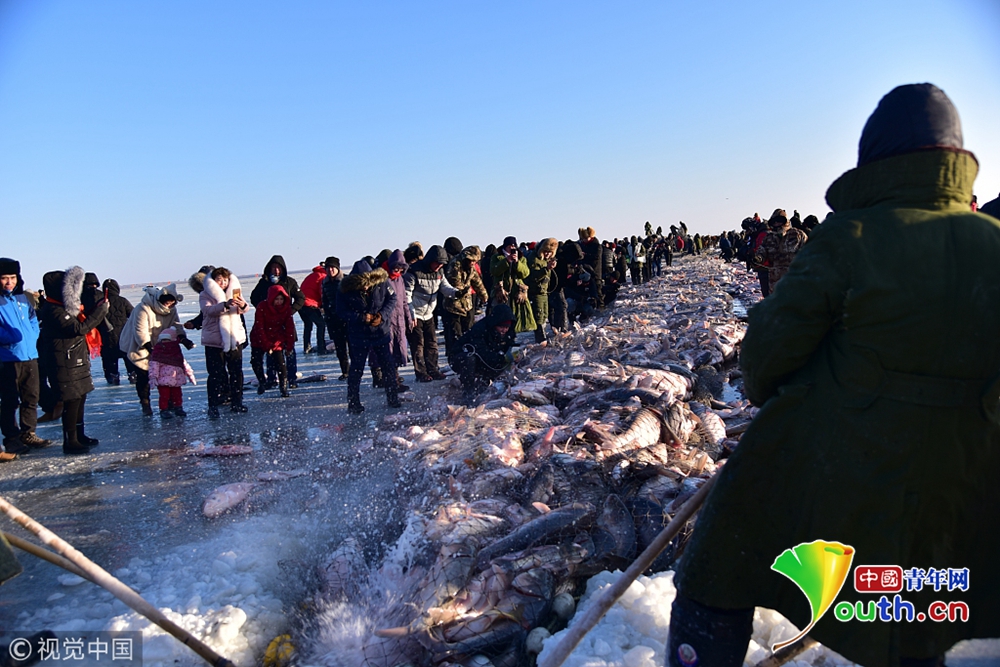 2018年12月26日,吉林松原,查干湖迎來了“紅網(wǎng)”,單網(wǎng)捕撈約30萬斤。