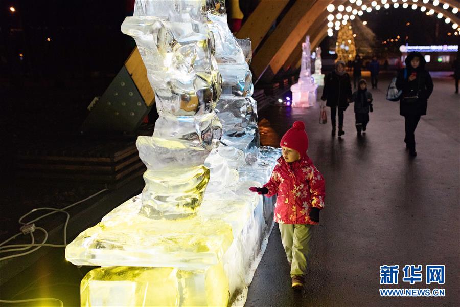 12月24日,在俄羅斯首都莫斯科,小朋友參觀冰雕藝術(shù)展。 新華社記者 白雪騏 攝