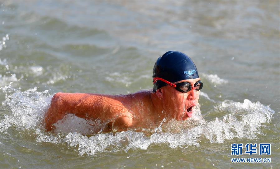 12月20日,83歲的冬泳愛好者周漢英在黃河冬泳。新華社記者陶希夷攝
