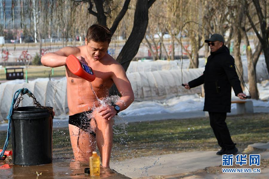 12月20日,冬泳愛好者張敏捷(左)在黃河中冬泳后在岸邊沖澡,身后的泳友在冬泳后跳繩暖身。新華社記者馬寧攝