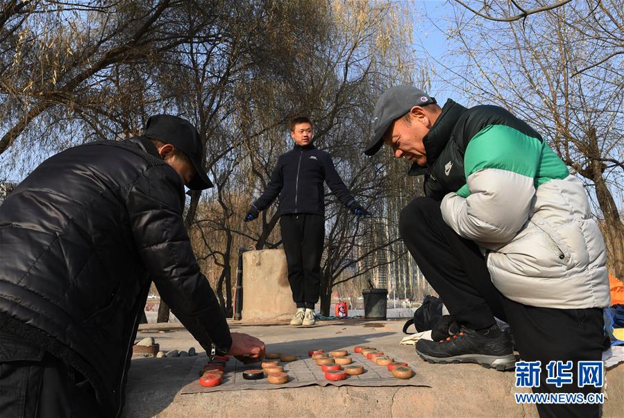 12月20日,冬泳愛(ài)好者張敏捷(中)冬泳后上岸跳繩暖身,張勝(右)結(jié)束冬泳后在一旁下棋。新華社記者陶希夷攝
