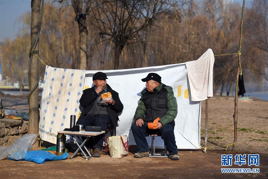 12月21日,72歲的石金城(左)在黃河中冬泳后在岸邊曬太陽(yáng),一邊聽(tīng)著西北民歌吃東西一邊和朋友交談。新華社記者陶希夷攝
