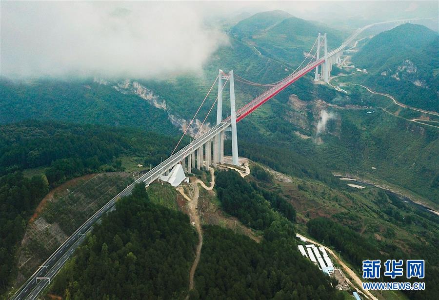 位于貴州、云南交界處杭瑞高速上的北盤江大橋(8月10日無人機拍攝)。其橋面至江面565.4米的垂直高度,被吉尼斯官方認證為“世界最高橋”。新華社記者陶亮攝