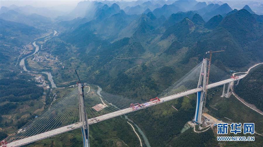 當日,332米高的全球最高混凝土橋塔——貴州平塘至羅甸高速公路控制性工程平塘特大橋成功合龍。記者從貴州省交通運輸廳了解到,平塘特大橋全長2135米,橋面寬30.2米,規(guī)劃雙向4車道,是一座三塔雙索面疊合梁斜拉橋。三座橋塔的高度分別為320米、332米和298米,相當于在峽谷之中建了三座100多層高的大樓。平塘特大橋于2016年4月開工建設,2018年11月橋塔順利封頂,計劃總工期為42個月,總投資15億元。此次合龍后,還要進行橋面施工和欄桿等工程建設,預計今年底全橋通車,屆時平塘到羅甸的通行時間將從2個半小時縮短至1小時,將成為連接貴州南部的交通要道,對助推滇黔桂石漠化片區(qū)脫貧攻堅具有重要意義。