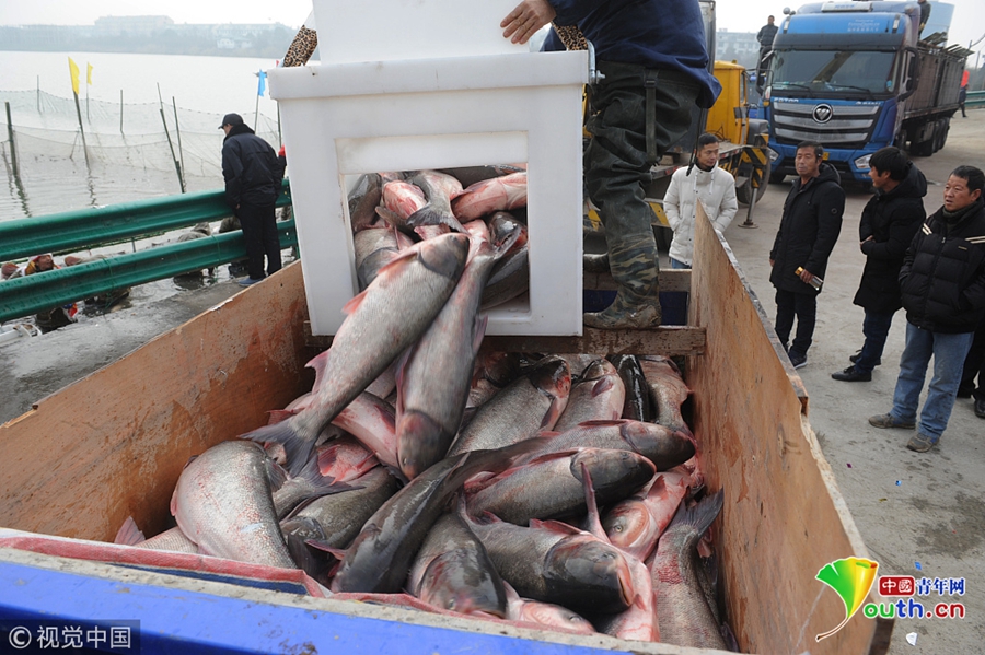 1月6日,安徽省阜陽市潁上縣八里河漁場正式開始進(jìn)行冬季大捕魚,捕獲的一條重達(dá)78斤的“頭魚”拍出88萬元,現(xiàn)場吸引眾多客商和廣大群眾觀看。據(jù)悉,此次所得拍賣款全部用于當(dāng)?shù)孛撠毠?。圖片來源:視覺中國