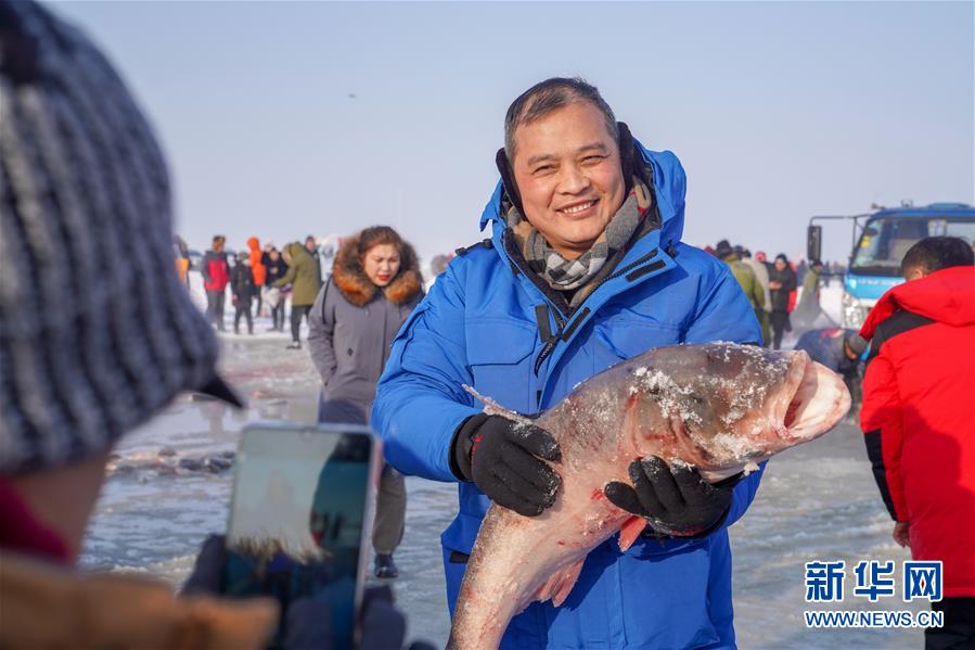 12月26日,在吉林松原查干湖冰面上,游客手捧剛打撈上來的魚拍照留念。隨著吉林松原查干湖冬捕知名度不斷提高,全國各地消費者對查干湖魚的需求量逐年增大。2014年開始,多個電商平臺和快遞企業(yè)紛紛抓住商機(jī)進(jìn)駐查干湖。經(jīng)過多年發(fā)展,借助互聯(lián)網(wǎng)銷售優(yōu)勢和日趨完善的快遞網(wǎng)絡(luò),全國多地的百姓可以在魚出水后的48小時內(nèi)品嘗到查干湖魚的鮮美滋味。新華社記者張楠攝
