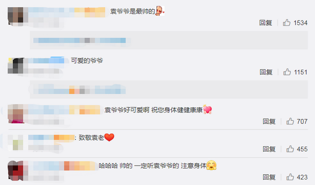 網(wǎng)友看后,紛紛評論,“袁爺爺是帥的”,“一定聽袁爺爺話注意身體”!