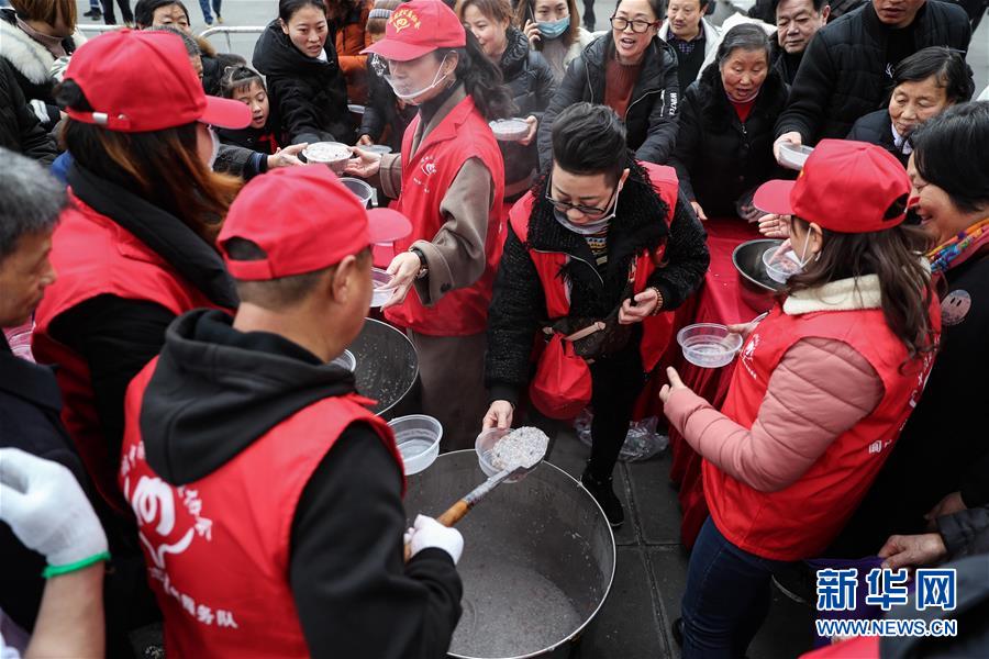 1月2日,志愿者在閬中古城貢院廣場(chǎng)給大家發(fā)放臘八粥。 當(dāng)日是農(nóng)歷臘月初八臘八節(jié),四川閬中古城舉行“萬(wàn)人同品臘八粥”活動(dòng),當(dāng)?shù)鼐用窈捅姸嘤慰驮谪曉簭V場(chǎng)免費(fèi)享用臘八粥。 新華社記者 江宏景 攝