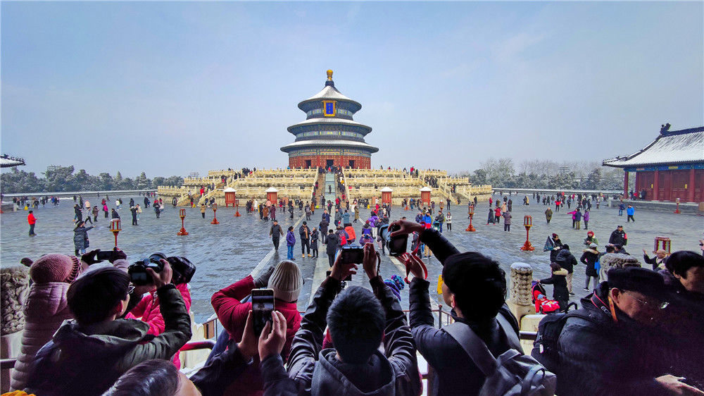 2019年11月30日,北京,初雪過后,天壇公園銀裝素裹,白雪古建相互映襯,景色迷人。天壇公園里觀雪賞景的市民絡繹不絕。喬?。垐D像/視覺中國