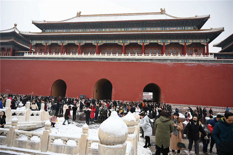 2019年11月30日,北京,一場初雪后,城市銀裝素裹,故宮博物院迎來今年第一批賞雪游客。
