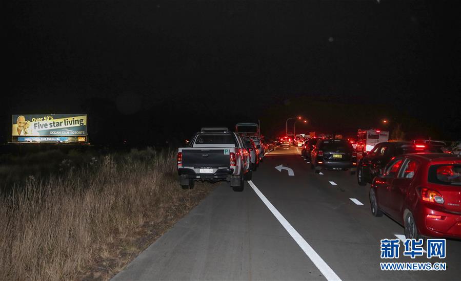 11月10日夜間,在澳大利亞新南威爾士州塔里附近道路上,由于山火封路,當(dāng)?shù)鼐用耨{車排隊等待前往避難所。新華社記者白雪飛攝