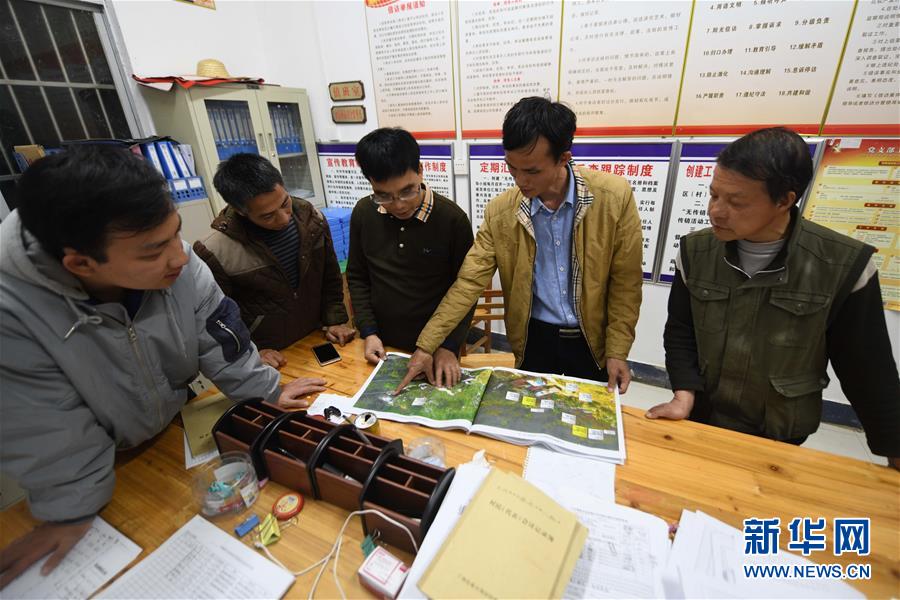 八好村駐村第一書記韋德王(左二)和同事在辦公樓里討論工作(2019年11月12日攝)。新華社記者黃孝邦攝