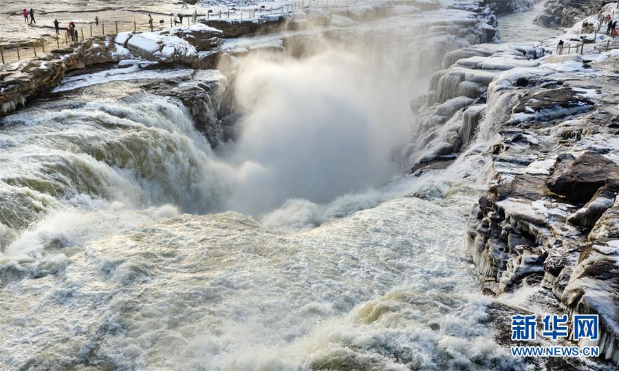 1月12日拍攝的黃河壺口瀑布的“水底冒煙”景觀(無(wú)人機(jī)照片)。新華社記者陶明攝