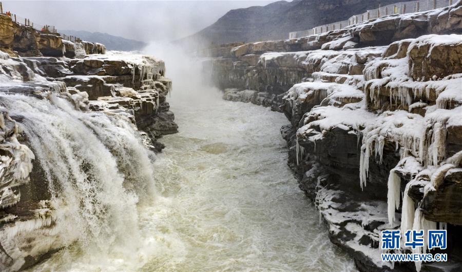 1月12日,黃河壺口瀑布景區(qū)內(nèi)的冰瀑與流動(dòng)的瀑布形成一幅獨(dú)特的景觀(無(wú)人機(jī)照片)。新華社記者陶明攝