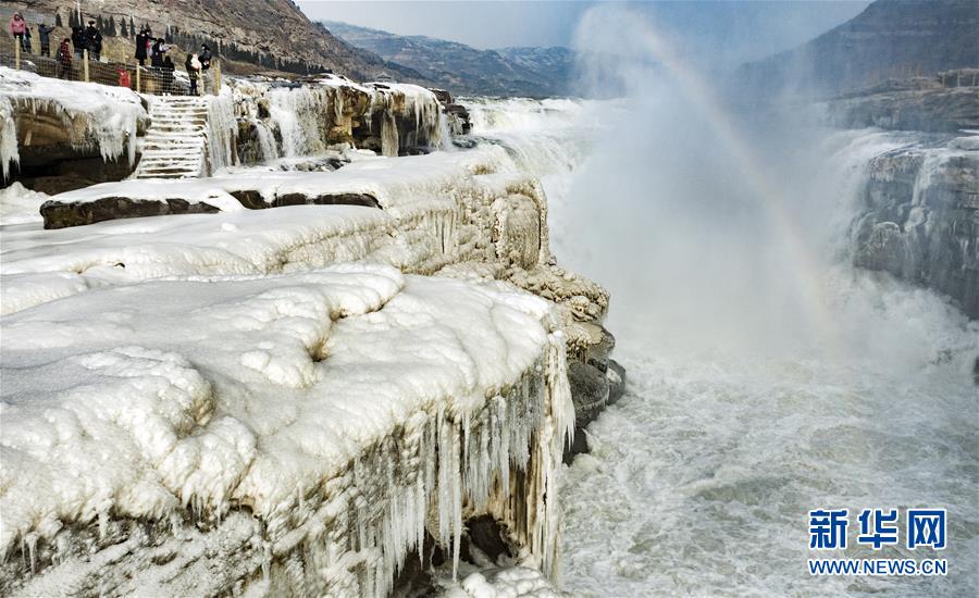 1月12日,冰雪下的黃河壺口瀑布在晨光中顯現(xiàn)一道美麗的彩虹(無人機(jī)照片)。新華社記者陶明攝