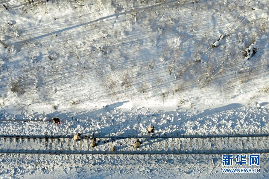 1月8日,西羅奇維修工隊工作人員在嫩林線501公里處進(jìn)行線路維修作業(yè)(無人機照片)。新華社記者王毓國攝